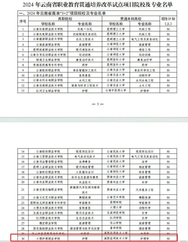 近日,云南省教育厅下发《关于启动实施2024年职业教育贯通培养改革试点工作的通知》,新葡萄奔驰AMG官网被确定为云南省高本“3+2”职业教育贯通培养改革试点项目院校,学校优质护理专业与滇西应用技术大学优质护理学专业合作开展高本“3+2”贯通培养,2024年计划招生50人。