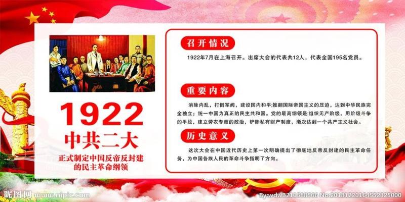 1922年7月16日至23日,中国共产党第二次全国代表大会在上海南成都路辅德里625号召开。出席会议的代表共12名(有一名代表姓名不详),代表全国195名党员。这些代表是:中央局委员陈独秀、张国焘、李达,上海的杨明斋,北京的罗章龙,山东的王尽美,湖北的许白昊,湖南的蔡和森,广州的谭平山,中国劳动组合书记部代表李震瀛,中国社会主义青年团临时中央局代表施存统。