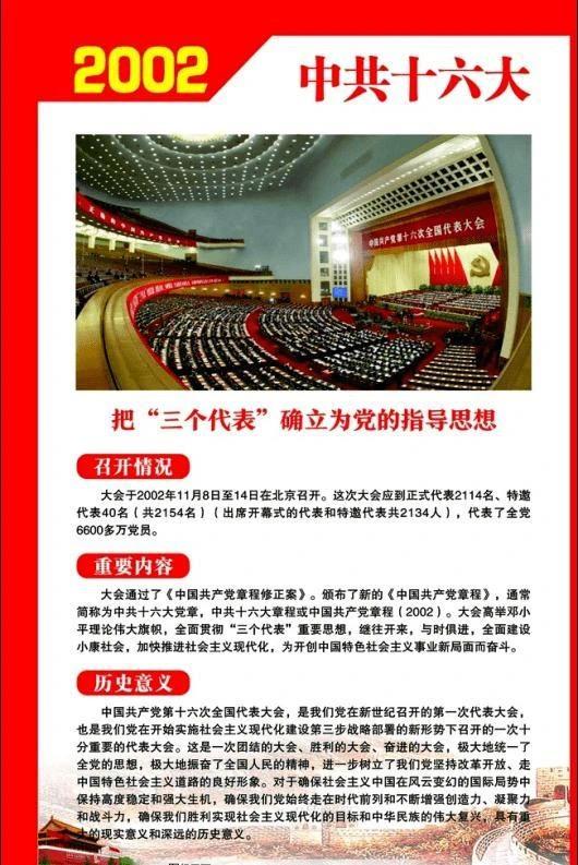 中国共产党第十六次全国代表大会是党在新世纪召开的第一次代表大会,也是在我国进入全面建设小康社会、加快推进社会主义现代化的新的发展阶段召开的一次承前启后、继往开来的大会;是高举邓小平理论伟大旗帜,全面贯彻“三个代表”重要思想,与时俱进、开拓创新的大会是进一步动员全党和全国各族人民,为开创中国特色社会主义事业新局面而团结奋进的大会。
