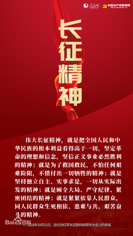 长征精神,红色革命精神之一,是中国共产党在二万五千里长征中创造的革命精神。红军指战员在长征途中表现出对革命理想和事业无比的忠诚、坚定的信念,表现出不怕牺牲、敢于胜利的无产阶级革命乐观主义精神,表现出顾全大局、严守纪律、亲密团结的高尚品德,创造了伟大的长征精神。集中体现为:坚韧不拔,自强不息,勇往直前。最显著特点是一不怕苦,二不怕死的革命英雄主义精神。长征精神是中华民族百折不挠、自强不息的民族精神的最高表现,是保证我们革命和建设事业走向胜利的强大精神力量。