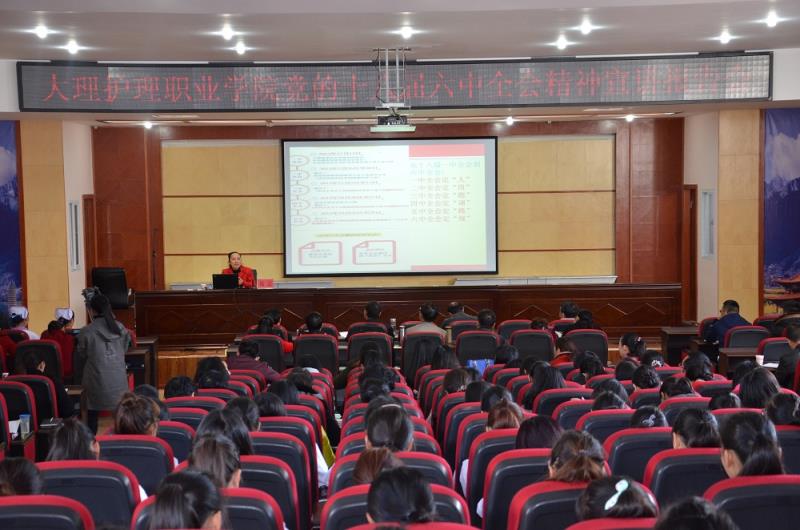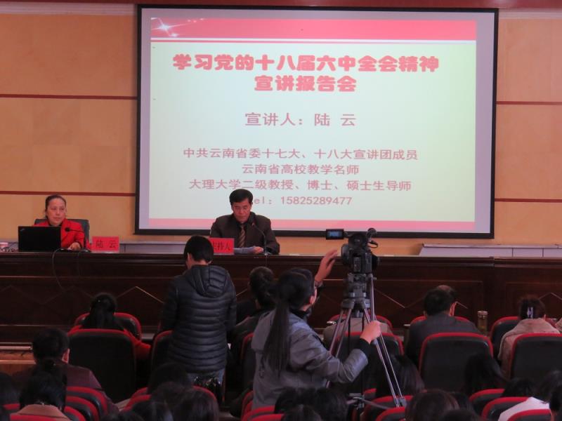 11月30日下午,校党委举行党的十八届六中全会精神宣讲报告会,邀请州委宣讲团成员、大理大学教授、硕士生导师陆云到校为全体教职工和部分学生代表共300多人作党的十八届六中全会精神宣讲报告。