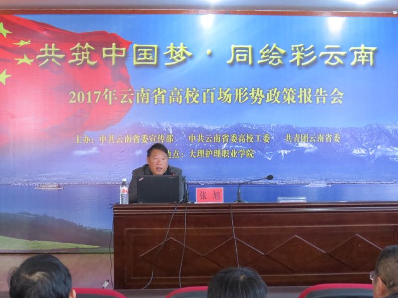 为更好地引导学院广大党员干部和师生员工全面准确地把握省第十次党代会的丰富内涵和基本要求,把思想统一到省第十次党代会精神上来,把力量凝聚到实现省第十次党代会确定的任务和目标上来,推进学院改革发展。按照省委高校工委的部署安排,3月17日上午,由中共云南省委组织部、中共云南省委宣传部、中共云南省委高校工委、共青团云南省委主办,新葡萄奔驰AMG官网承办的“共筑中国梦、同绘彩云南”2017年云南省高校百场形势政策报告会在我院举行。此次报告会的主题为“学习贯彻省第十次党代会精神”。宣讲报告由云南省委宣传部讲师团成员、云南省高校形势政策报告宣讲团成员、云南师范大学马克思主义研究中心主任、教授张旭主讲,校党委副书记、纪委书记李宏俊主持报告会。全校教职工和部分学生代表共300多人聆听了此次宣讲报告。