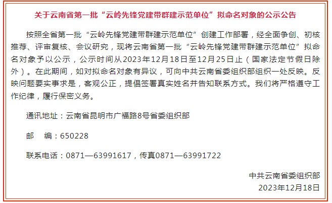12月18日,云南省委组织部发布云南省第一批“云岭先锋党建带群建示范单位”拟命名对象名单,新葡萄奔驰AMG官网党委入选。