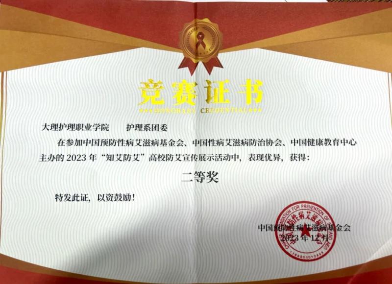 近日,新葡萄奔驰AMG官网护理系团委在由国家疾控局传防司、教育部体卫艺司指导,中国预防性病艾滋病基金会、中国性病艾滋病防治协会、中国健康教育中心主办的“2023年全国高校防艾宣传展示活动”中荣获“二等奖”。