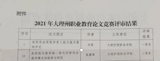 根据《教育部等十部门关于做好 2021 年职业教育活动周相关工作的通知》(教职成函[2021]5号)和省有关要求,大理州教育体育局制定了《大理州 2021 年职业教育活动周工作方案》,举办了一系列职业教育宣传活动,职业教育论文竞赛是其中一项活动内容。近期,州教体局公布了2021年职业教育论文竞赛结果的通知,新葡萄推荐的2篇论文在本次评比活动中获奖。