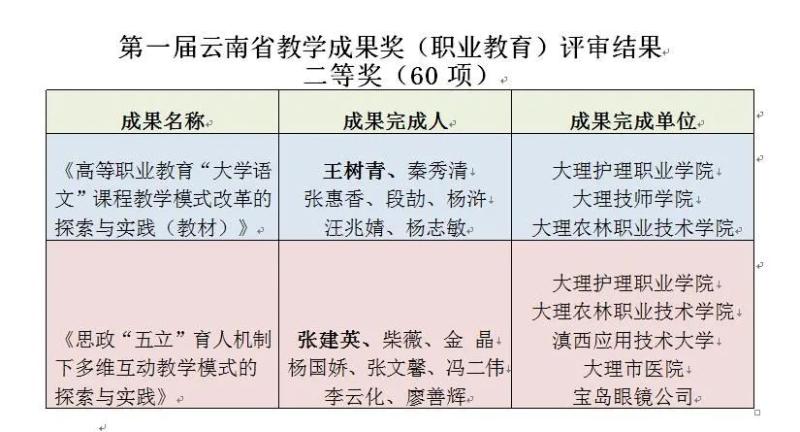 近日,云南省教育厅关于第一届云南省教学成果奖(职业教育)评审结果公示,新葡萄王树青教授主持申报的《高等职业教育“大学语文”课程教学模式改革的探索与实践(教材)》和张建英教授主持申报的《思政“五立”育人机制下多维互动教学模式的探索与实践》均荣获第一届云南省教学成果奖(职业教育)二等奖。