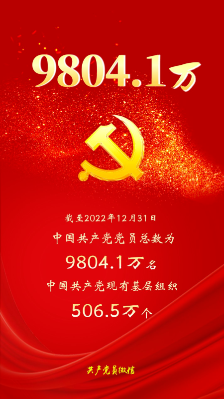 截至2022年12月31日,中国共产党党员总数为9804.1万名,比2021年底净增132.9万名,增幅为1.4%。