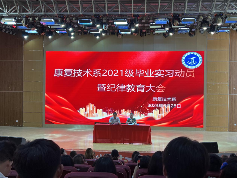 6月28日,新葡萄奔驰AMG官网康复技术系召开2021级毕业实习动员大会暨第六届学生康复技能大赛颁奖仪式,进一步扎实做好2021级学生毕业实习工作,让学生明确实习的目的和重要意义,强化实习安全管理,正风肃纪,表彰先进。学校党委书记廖惠群出席会议,康复技术系教师和2021级全体学生参加了会议。会议由李波副主任主持。