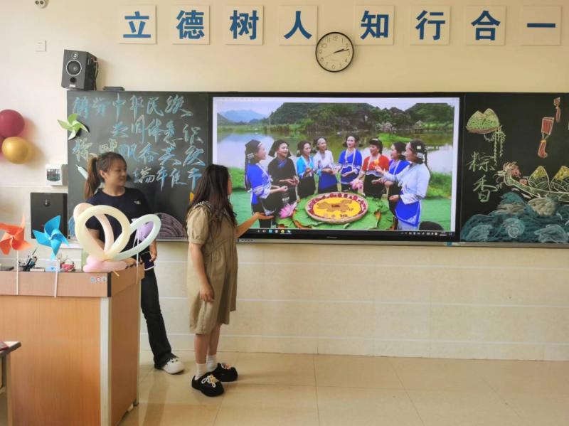 师生们齐心协力、团结协作,一起洗粽叶,淘糯米,切配料,包粽子,体验了粽子制作的全过程。教室里,清新的粽叶飘香四溢,欢笑声此起彼伏。大家还一起编织和佩戴象征喜庆、吉祥的五彩绳,看图猜成语。师生度过了一个温暖、欢乐的端午节,增进了团结,促进友谊,传承中华优秀传统文化,汇聚精神力量。