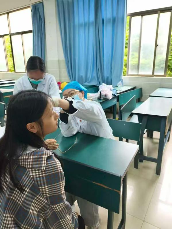 体检现场,门诊部党支部提前规划流程、科学划分区域,设置了身高体重测量、视力屈光度检查、心肺听诊、血生化等多个标准化检查环节,涵盖了内外科、五官科、眼科、抽血化验、胸透等多功能指标检查,全方位守护学生健康。护理系党支部党员志愿们热情引导,医护人员专业细致地开展工作,严格按照体检规范完成各项检查操作,针对同学们提出的健康疑问,医护人员们耐心细致逐一解答,用专业与温柔缓解新生们的紧张情绪。