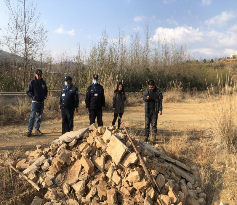 检查人员首先对学院后山进行巡查,巡查中发现后山堆放有学院施工单位倾倒的大量建筑物垃圾,杨斌科长及时联系了后勤科赵主任,联合后勤科督促施工方尽快对该建筑垃圾进行清理。