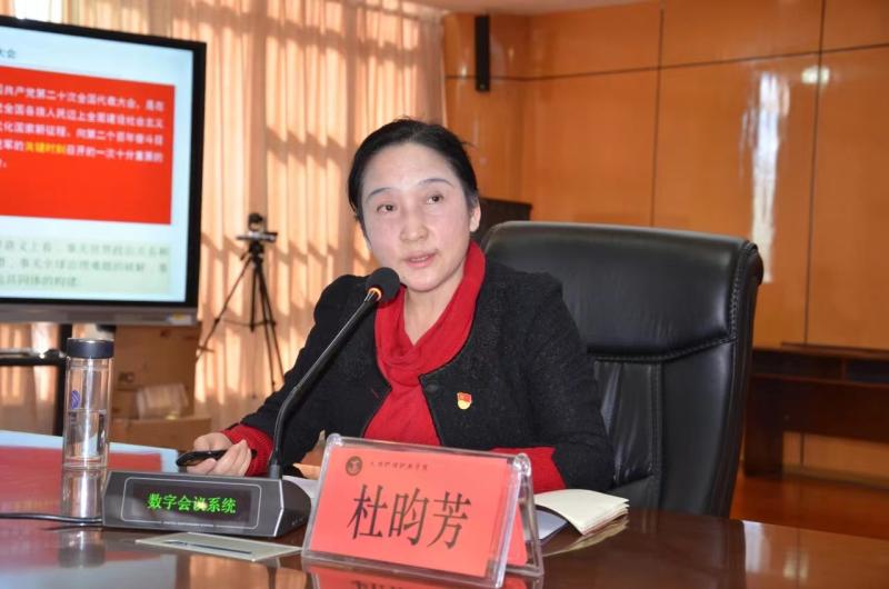 思政部主任杜昀芳副教授以《建功新时代 奋进新征程——学习宣传贯彻党的二十大精神》为题,从深刻认识党的二十大召开的重大意义、加深理解党的二十大主题、解读党的二十大报告主要内容等三个方面作专题学习辅导。