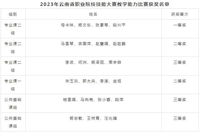7月15日,由云南省教育厅主办,云南机电职业技术学院承办的“2023年云南省职业院校技能大赛教学能力高职组比赛”在昆明顺利落下帷幕。新葡萄参赛的6个项目全部获奖,荣获1个一等奖、2个二等奖和3个三等奖。