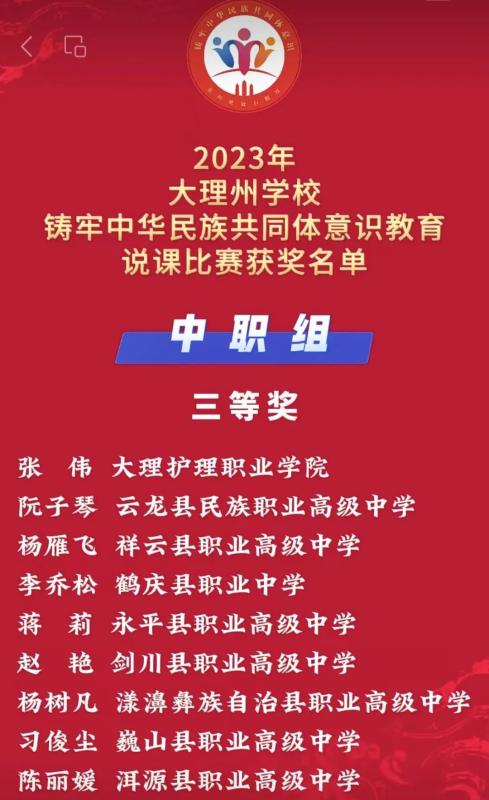 9月13日~15日,2023年大理州学校铸牢中华民族共同体意识教育说课比赛在南涧县民族中学举行,全州共56名选手参赛。经比赛评审,新葡萄奔驰AMG官网张伟老师喜获中职组三等奖,新葡萄奔驰AMG官网荣获“优秀组织单位”称号。
