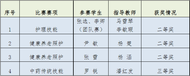 护理技能赛项目张选、李卿同学分别荣获二等奖,马雪琴、李敏瑕老师分别荣获优秀指导教师二等奖