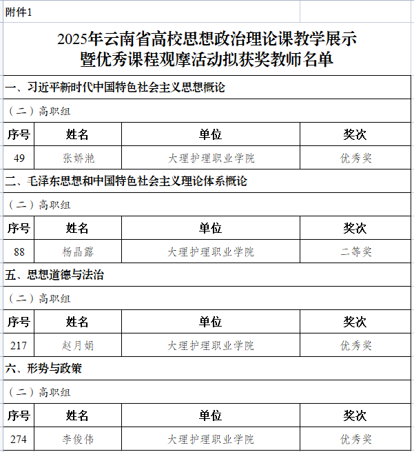 2025年云南省高校思想政治理论课教学展示暨优秀课程观摩活动决赛近日在昆明圆满落幕,新葡萄马克思主义学院教师表现突出,斩获多项佳绩:杨晶露老师荣获“毛泽东思想和中国特色社会主义理论体系概论”课程高职高专组二等奖;赵月娟、张娇滟、李俊伟三位老师分获“思想道德与法治”、“习近平新时代中国特色社会主义思想概论”、“形势与政策”课程高职高专组优秀奖。