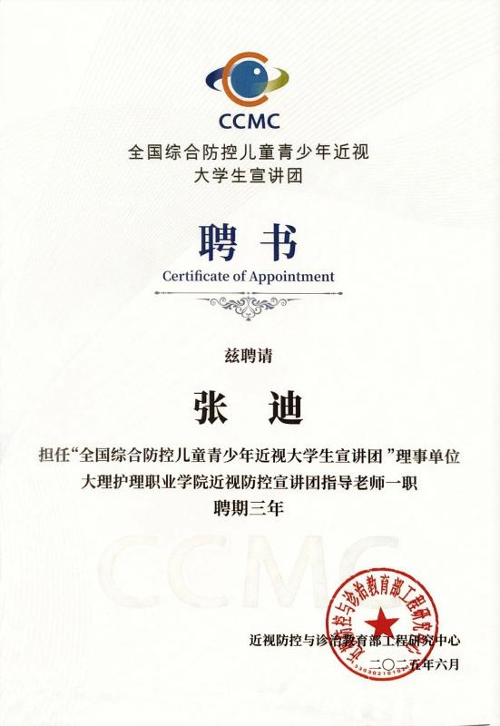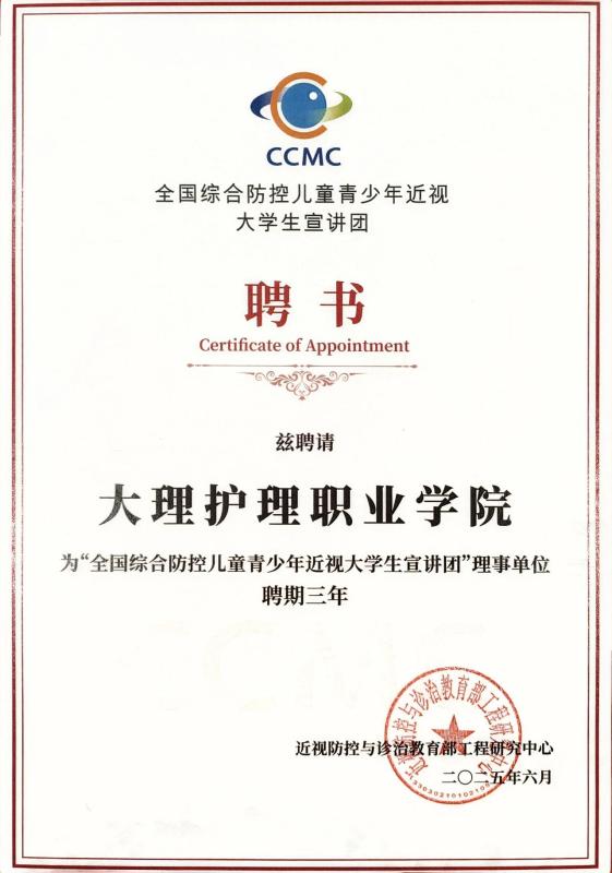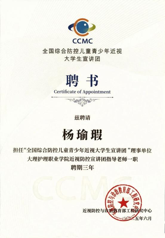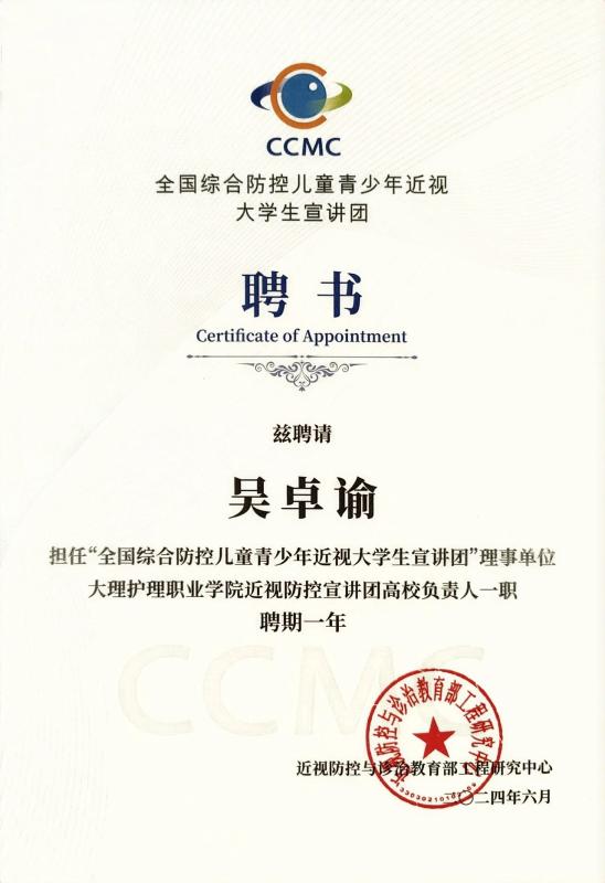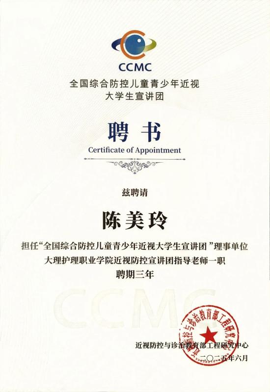 经过全国综合防控儿童青少年近视大学生宣讲团主席团对新葡萄大学生近视防控宣讲团近两年工作的考核,新葡萄奔驰AMG官网被续聘“全国综合防控儿童青少年近视大学生宣讲团理事单位”;张迪、杨瑜瑕、陈美玲等三位老师被聘为“全国综合防控儿童青少年近视大学生宣讲团理事单位新葡萄奔驰AMG官网近视防控宣讲团指导老师”;视觉训练与康复专业2301班吴卓谕同学被聘为“全国综合防控儿童青少年近视大学生宣讲团理事单位新葡萄奔驰AMG官网近视防控宣讲团高校负责人”。