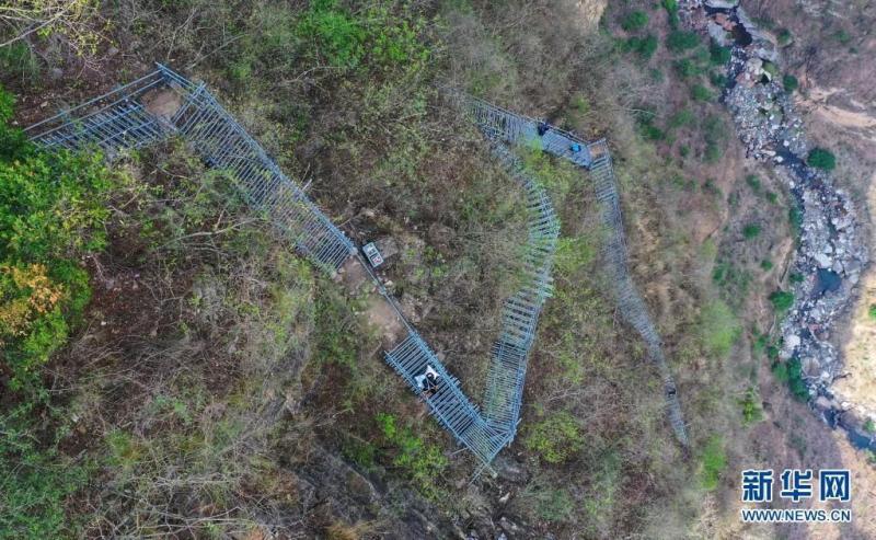 在四川省凉山彝族自治州昭觉县阿土列尔村的悬崖钢梯上,村民沿着钢梯下山(2020513日摄,无人机照片)。新华社记者 王曦 摄