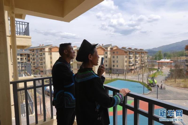 在四川省昭觉县城易地扶贫搬迁安置点南坪社区,刚搬迁到新家的“悬崖村”村民莫色达体夫妇在阳台给亲戚打电话(2020513日摄)。新华社记者 江宏景 摄