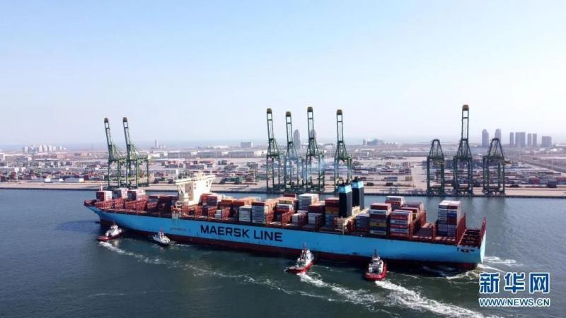 一艘载有集装箱的货轮驶入天津港码头(222日摄,无人机照片)。新华社记者 赵子硕 摄