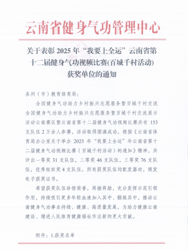 近日,新葡萄奔驰AMG官网代表队在云南省第十二届“我要上全运”健身气功视频比赛中荣获一等奖。这是学校继2025年10月18日至19日在滇西应用技术大学举办的云南省高等院校健身气功锦标赛中斩获21项奖项后,取得的又一重要奖项,充分展现了学校在健身气功领域的扎实积累与持续进步。