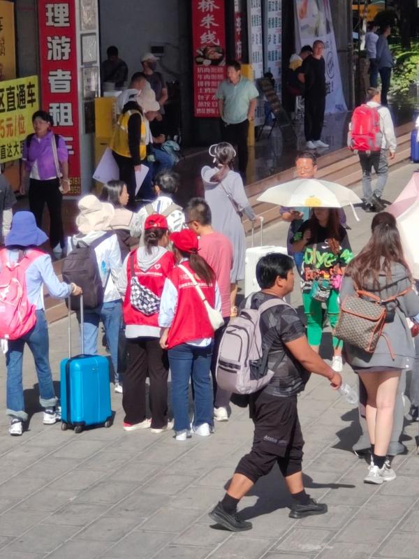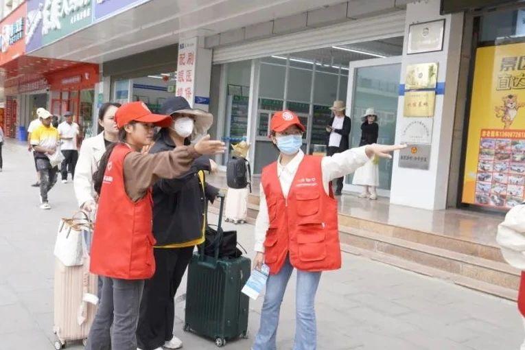 “双节”期间,大理开启“人从众”模式,每天都有来自全国各地的游客们落地大理站,从这里开始惬意的假期。在人来人往中,我们的志愿者学生身穿红马甲,坚守在出站口及天桥对面的重点路段,为游客提供全面贴心的志愿服务,展示大理青年的良好精神风貌。