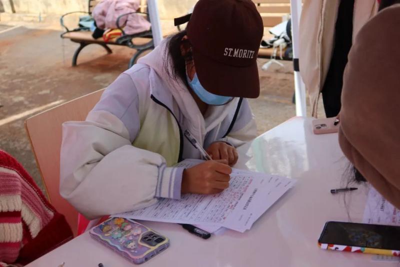 活动现场,志愿者们配合医护人员向来往同学对无偿献血的基本条件、流程,献血前后的注意事项等相关安全知识进行科普,指导献血同学填写相关资料。