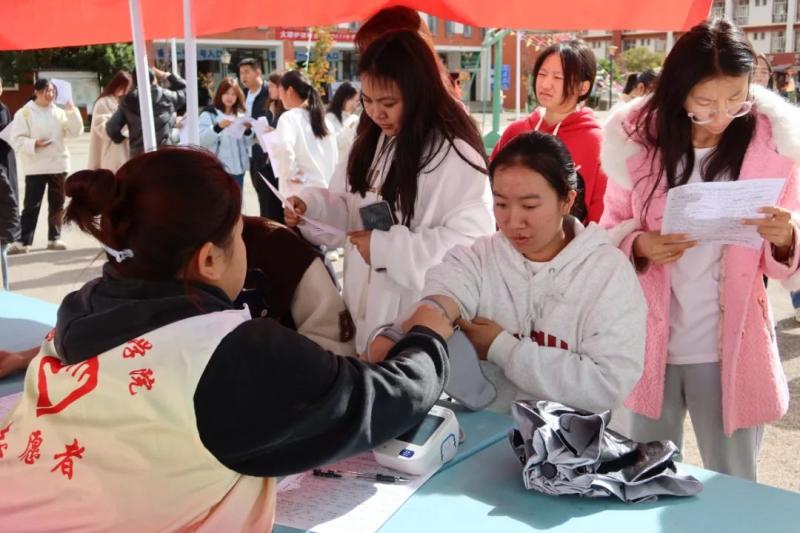 护理专业志愿者学生,充分发挥专业技能,配合医护人员进行血压测量。