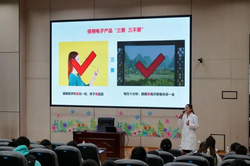 宣讲活动结合小学阶段学生近视防控特点,用简单生动的宣讲方式,力求使小朋友现学现懂,内化于行、自律依从、持之以恒,宣讲以小合唱《光明的未来》开场,现场气氛瞬间活跃起来,随后依次进行了“儿童青少年使用电子产品要求”、“增加户外活动能够有效预防近视”、“正确坐姿、握笔姿势及20-20-20护眼法则”、“健康饮食、平衡饮食”四个方面的宣讲,最后以一首小合唱《你是我的眼》圆满收场。整个宣讲活动内容接地气、语言活泼、互动有序,使小朋友们认识到了自身就是“自己视觉健康第一责任人”意识,宣讲活动达到了预期效果。