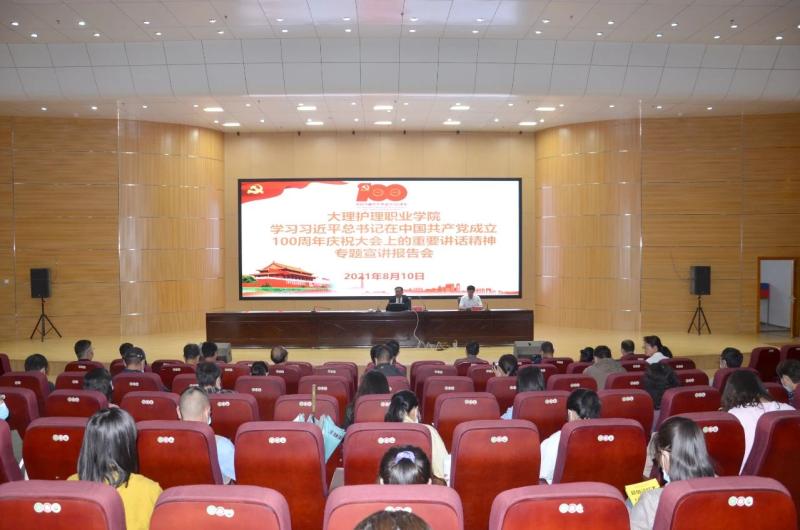 8月10日,根据大理州委党史学习教育领导小组部署安排,新葡萄奔驰AMG官网举行学习贯彻习近平总书记在庆祝中国共产党成立100周年大会上的重要讲话精神专题宣讲报告会。报告会由州委宣讲团成员,州委党校副教授、文史教研室主任杨宗老师以“新时代的政治宣言和行动指南”为主题进行专题宣讲。学院党委领导班子成员、党员、干部和教职工139人参加宣讲报告会,会议由学院党委书记王荣富主持。