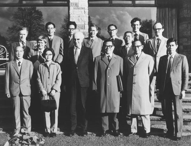 1964年6月,江泽民同志(二排右一)在法国艾克斯莱班出席国际电工委员会会议期间同与会代表合影。