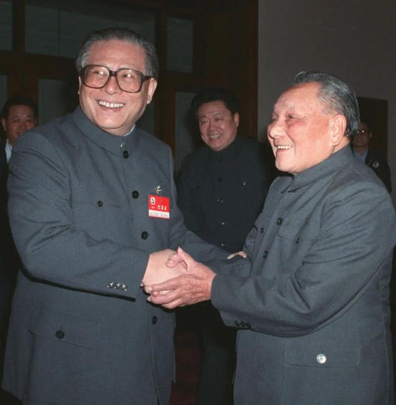 1989年11月6日至9日,中国共产党第十三届中央委员会第五次全体会议在北京召开。这是邓小平同志和江泽民同志亲切握手。