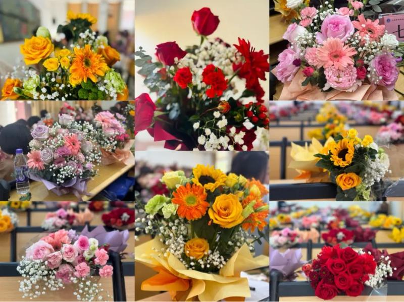 阳春三月,春意正好,繁花正茂。清新淡雅的康乃馨,娇艳似火的红玫瑰,朝气蓬勃的向日葵......一束束色彩斑斓的鲜花整齐有序地摆放在桌面上,花香瞬间扩散开来......活动邀请了大理技师学院段劼老师开展专题讲座,以“劳动创造美,向美而行”为主题,从插花艺术欣赏、花材选择与搭配、花材的固定、插花步骤等多方面讲解插花技巧,并现场进行插花示范,带领大家走进唯美的花艺世界。