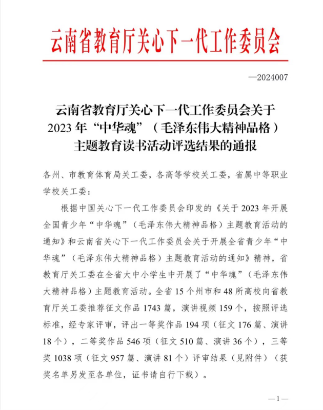 近日,云南省教育厅关心下一代工作委员会2023年“中华魂”(毛泽东伟大精神品格)主题教育读书活动评选结果公布,新葡萄关工委推荐参赛的征文作品共获奖5项,即获得2个二等奖和3个三等奖。