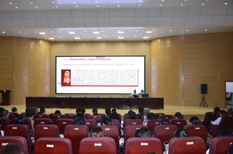 王国强教授以《进一步全面深化改革、推进中国式现代化的重大意义和总体要求》为题,从深刻认识党的二十届三中全会的主题;深刻认识进一步全面深化改革的重要性和必要性;进一步全面深化改革的指导思想;进一步全面深化改革的总目标;全面准确理解《决定》提出的进一步全面深化改革重大举措;贯彻落实全会精神的基本要求,进一步全面推进中国式现代化等六个方面进行了深入浅出的阐述和系统讲解。宣讲主题鲜明、分析透彻、内容丰富、理论联系实际,引导学校全体师生深刻认识到自身肩负的使命和责任,将学习成果转化为推动学校内涵式发展、提升人才培养质量、服务地方经济社会发展的强大动力。
