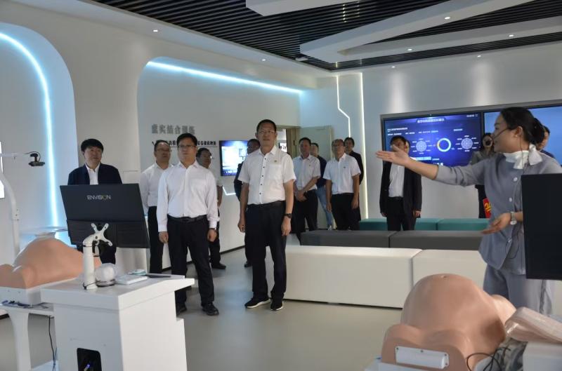 陈真永一行深入学校护理虚拟仿真实训中心、近视防控科普教育基地、学生食堂等场所,通过实地察看、听取汇报等方式,详细了解学校校园建设、师资规模、专业设置、招生录取、实习就业等工作后,对学校取得的成绩给予了充分肯定。