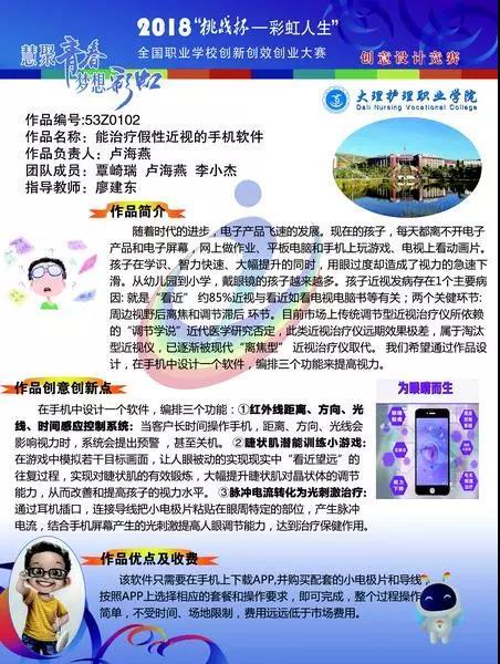 二、我院在“2018‘挑战杯—彩虹人生’全国职业学校创新创效创业大赛”中凭借‘能治疗假性近视的手机软件’项目荣获了此次大赛的二等奖
