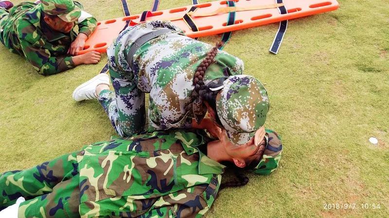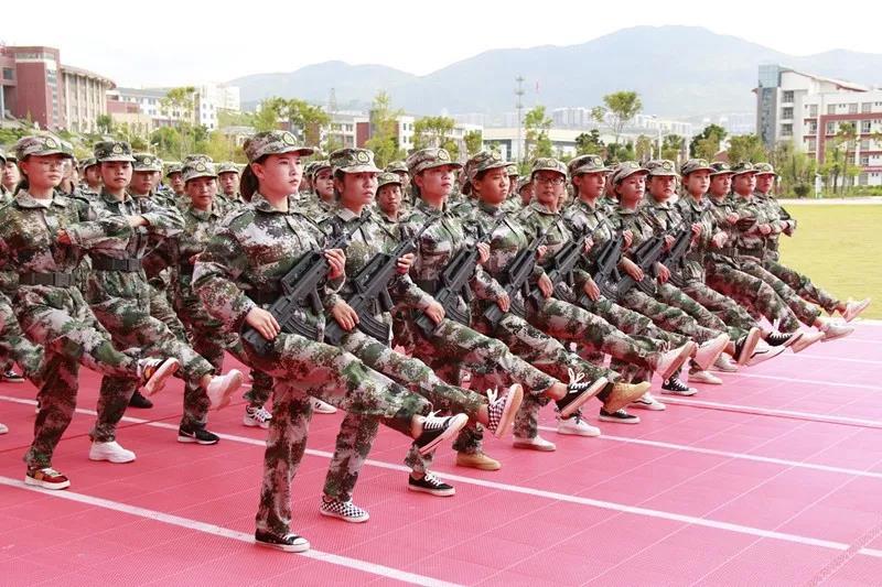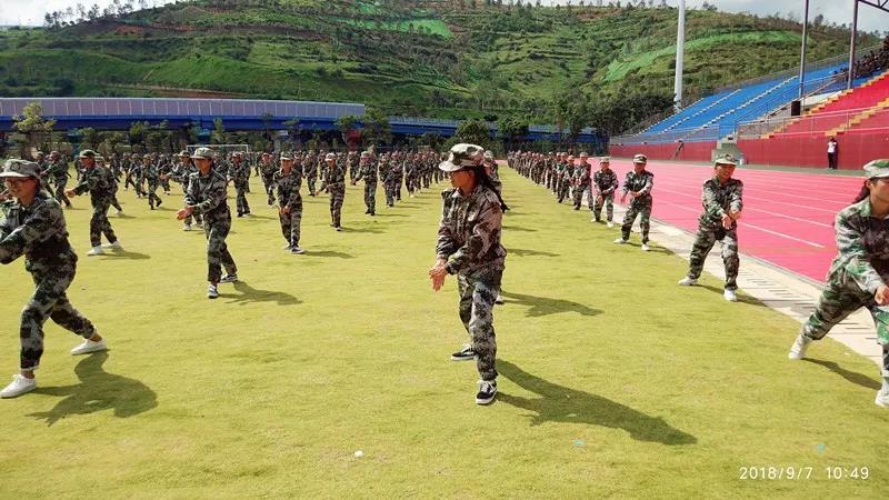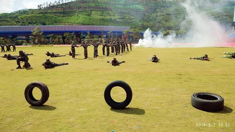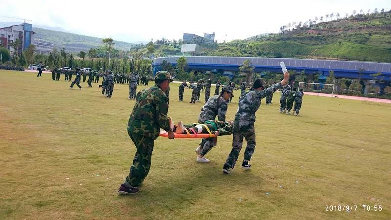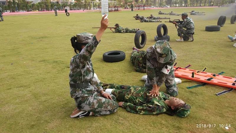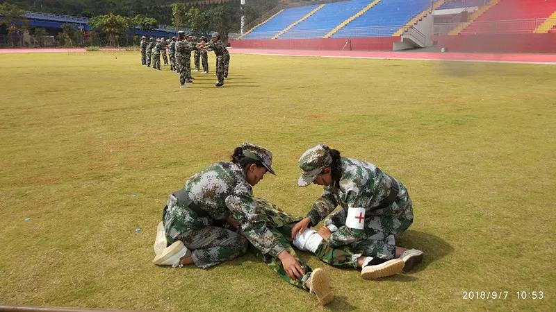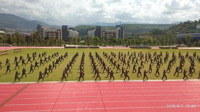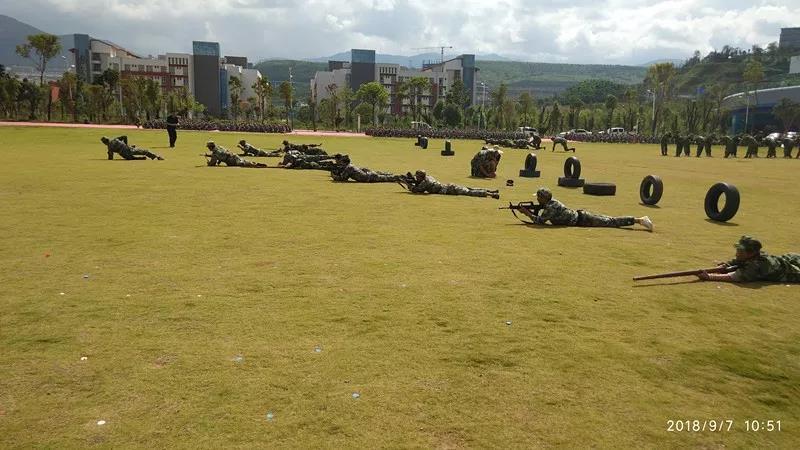 紧接着,进行了2018级新生军训汇报表演,表演分为两个部分:一是分列式;二是军训成果汇报表演,其中军训成果汇报表演的内容有“队列科目表演”、“军体拳术表演”、“战术战场救护科目表演”、“队列花样操科目表演”。从分列式开始到结束整个训练场气势恢宏。在部队教官亲切的关怀和严格训练下,在短短的十五天里,站军姿、齐步走、正步走、齐步变正步、解散、集合及分列式、变队走、军习演练等预定训练科目自此展现的淋漓尽致。整齐的方队,饱满的精神,矫健的步伐、准确的口令、嘹亮的声音搏得了在场领导和全体观众的热烈掌声。表演十分精彩,参训同学也都表演得非常认真,场面十分壮观,让人应接不暇。