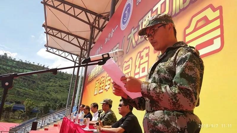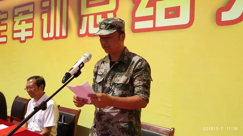 军训承训部队总教官王月凯进行了讲话。他祝贺此次新生军训训练的圆满成功,并希望2018级全体新生接下来能够更加坚强、不怕苦、不怕累地去迎接接下来的校园生活,并好好学习,报效祖国。