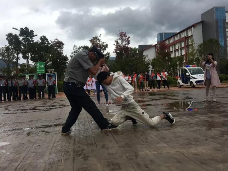 为切实加强防恐反恐工作,提高全体师生的防范意识,结合学院实际,新葡萄奔驰AMG官网于9月18日中午在学院知行广场,组织了一次防恐反恐演习活动。新葡萄奔驰AMG官网党委书记王荣富、学院院长蔡德周、学院副院长李一忠等领导、以及各班主任、各班班长等部分学生、志愿者及保安人员;大理市海东派出所巡逻中队的四名民警参加了此次活动。