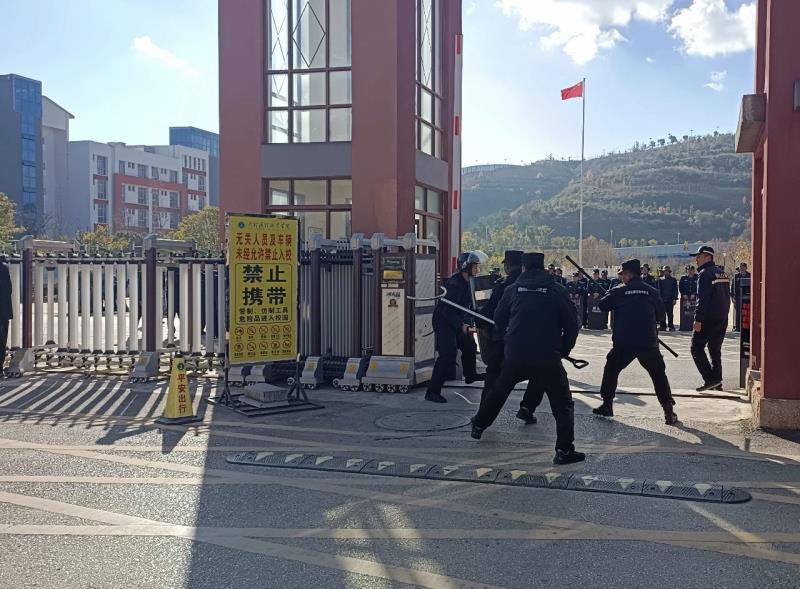 演练模拟“暴徒”持刀闯入校园的场景。保安人员迅速启动应急预案,手持装备与“歹徒”周旋,辖区派出所、巡特警大队接到报警后,快速赶到现场将“暴徒”制服。演练结束,大理市巡特警大队对保安人员就校园反恐防暴培训作了系统、全面的指导培训,详细讲解了反恐防暴技能和应对方法,对防暴盾牌、钢叉、胶棍等警械装备使用作了手把手的指导。