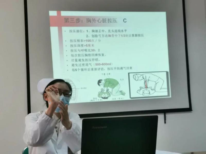 本次讲座采取知识点讲授和实操视频观看两种形式进行。培训中首先观看了徒手心肺复苏视频,护理部杨啟业护士长结合心肺复苏操作流程分解细化进行详细讲解,首先为大家讲授意识判断、自主呼吸判断、有无脉搏波动等初期判断;其次对周围环境进行判断,并立即进行呼救和拨打抢救电话等;并对操作过程中清理呼吸道、开放气道、人工呼吸、按压深度等细节进行详细讲授;最后再次播放心肺复苏的视频进行实操演示。