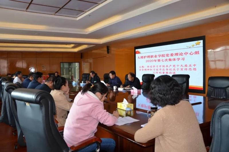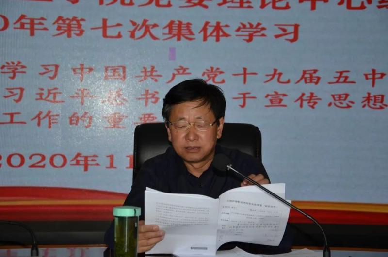 11月11日,学院党委理论学习中心组举行2020年第七次集体学习,集中传达学习党的十九届五中全会精神和习近平总书记关于宣传思想工作的重要论述以及《中国共产党宣传工作条例》。
