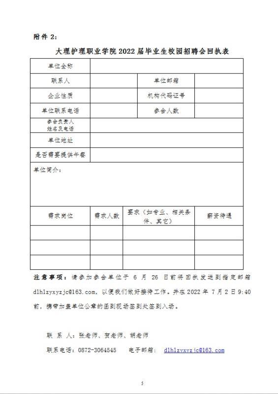 2.请按附件2认真填写的《新葡萄奔驰AMG官网2022届毕业生招聘单位回执表》并于2022年6月26日前将回执以电子邮件形式发送至dlhlzyxyzjc@163.com,以便我们安排展位。
