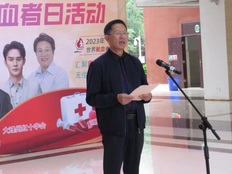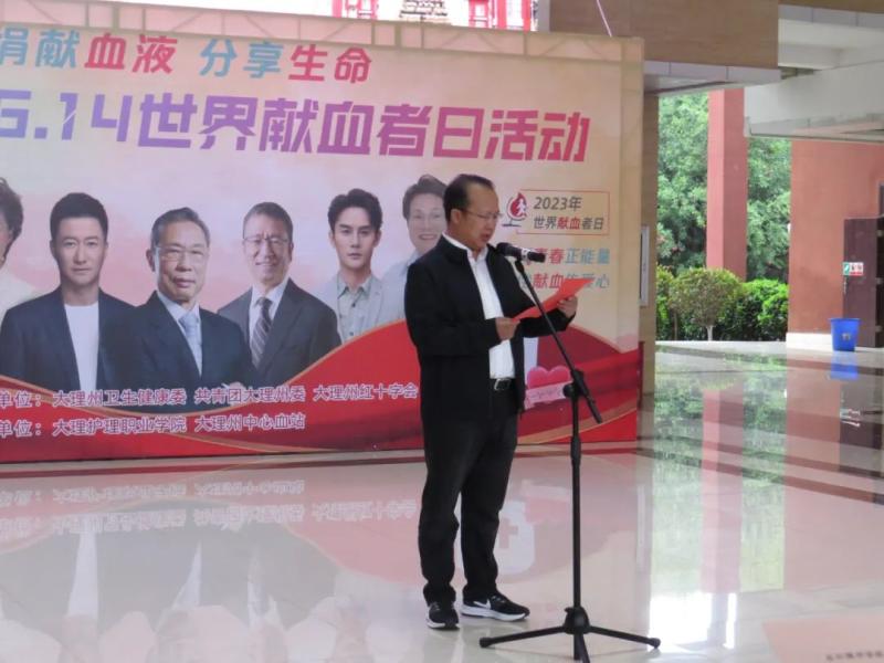 6月13日上午,大理市2023年世界献血者日活动启动仪式在新葡萄举行。大理州卫生健康委员会副主任李宏军,共青团大理州委副书记周子楠,大理州红十字会三级调研员袁德馨,大理州中心血站副站长杨静雄、郑智刚,纪检监察室主任毛丽华,学校党委副书记、院长蔡德周,党委专职副书记字利鹏、副院长郭向周等出席活动。大理州中心血站相关医务人员、学校学生科、团委教职工和参加无偿献血师生代表参加启动仪式。启动仪式由郭向周副院长主持。