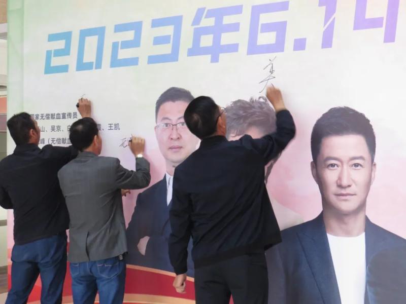 出席活动的领导和师生代表在无偿献血活动签名墙上签字。