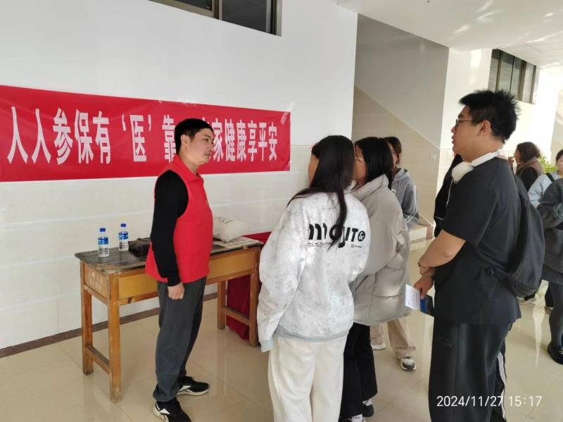 11月27日,学校门诊部联合学生科邀请大理市医保局进校开展“大学生城乡居民医疗保险政策”宣传活动。进一步落实省州市医疗保障部门要求,加强大学生城乡居民医疗保险的参保缴费工作,努力实现“应参尽参、应保尽保、应缴尽缴”,从而为减轻大学生医疗费用负担,防止患病的社会成员“因病致贫”情况发生。