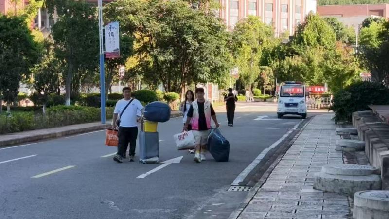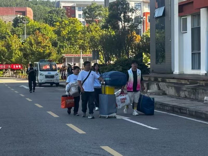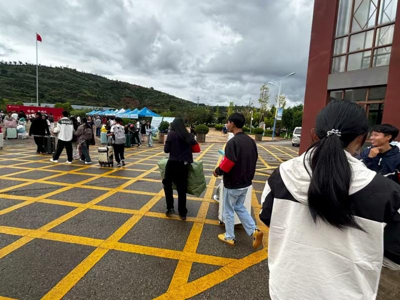 校园内洋溢着热烈的迎新氛围。"热烈欢迎2025级新同学"的横幅在教学区、生活区醒目悬挂;报到接待点、家长休息区等服务设施井然有序,为新生及家长提供了温馨周到的服务保障。
