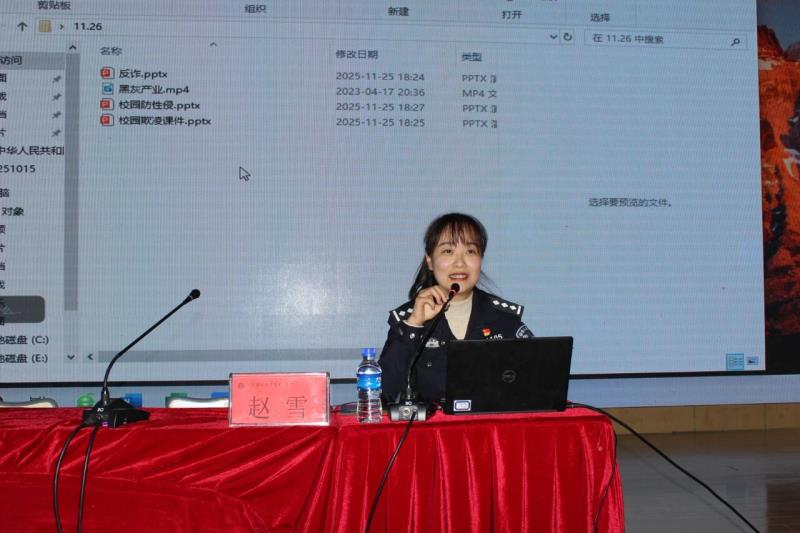 11月26日,新葡萄奔驰AMG官网特邀大理市公安局刑侦大队新型网络犯罪侦查中队民警赵雪,为全校师生带来一场主题鲜明、内容翔实的预防电信诈骗暨安全法制教育专题讲座。进一步强化校园安全防线,提升学生法治观念与自我保护能力,营造平安和谐的育人环境。讲座由学生科副科长张小蓉老师主持,全校3900余名师生在第一报告厅和班级教室,通过线上线下聆听了讲座。