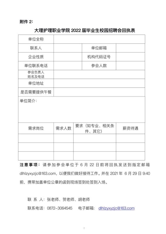 2.请按附件2认真填写的《新葡萄奔驰AMG官网2022届毕业生招聘单位回执表》并于2022年6月26日前将回执以电子邮件形式发送至dlhlzyxyzjc@163.com,以便我们安排展位。